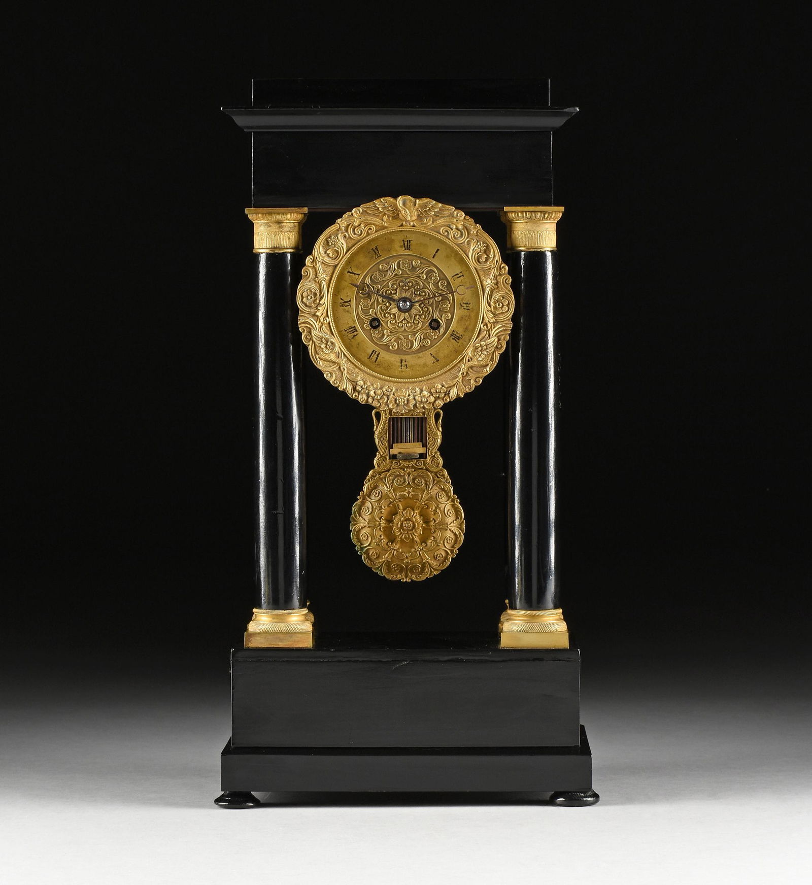 A CHARLES X ORMOLU MOUNTED EBONIZED WOOD PORTICO CLOCK,
