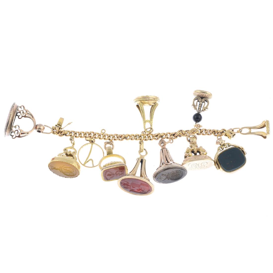 SoldAn early 20th century gold bracelet. Designed as aAn early 20th century gold bracelet. Designed as a hollow curb-link chain, with heart-shape padlock clasp, suspending a horse hoof locket and Masonic agate fob. Length 20cms. Total weight 36.7gms.See Sold Price