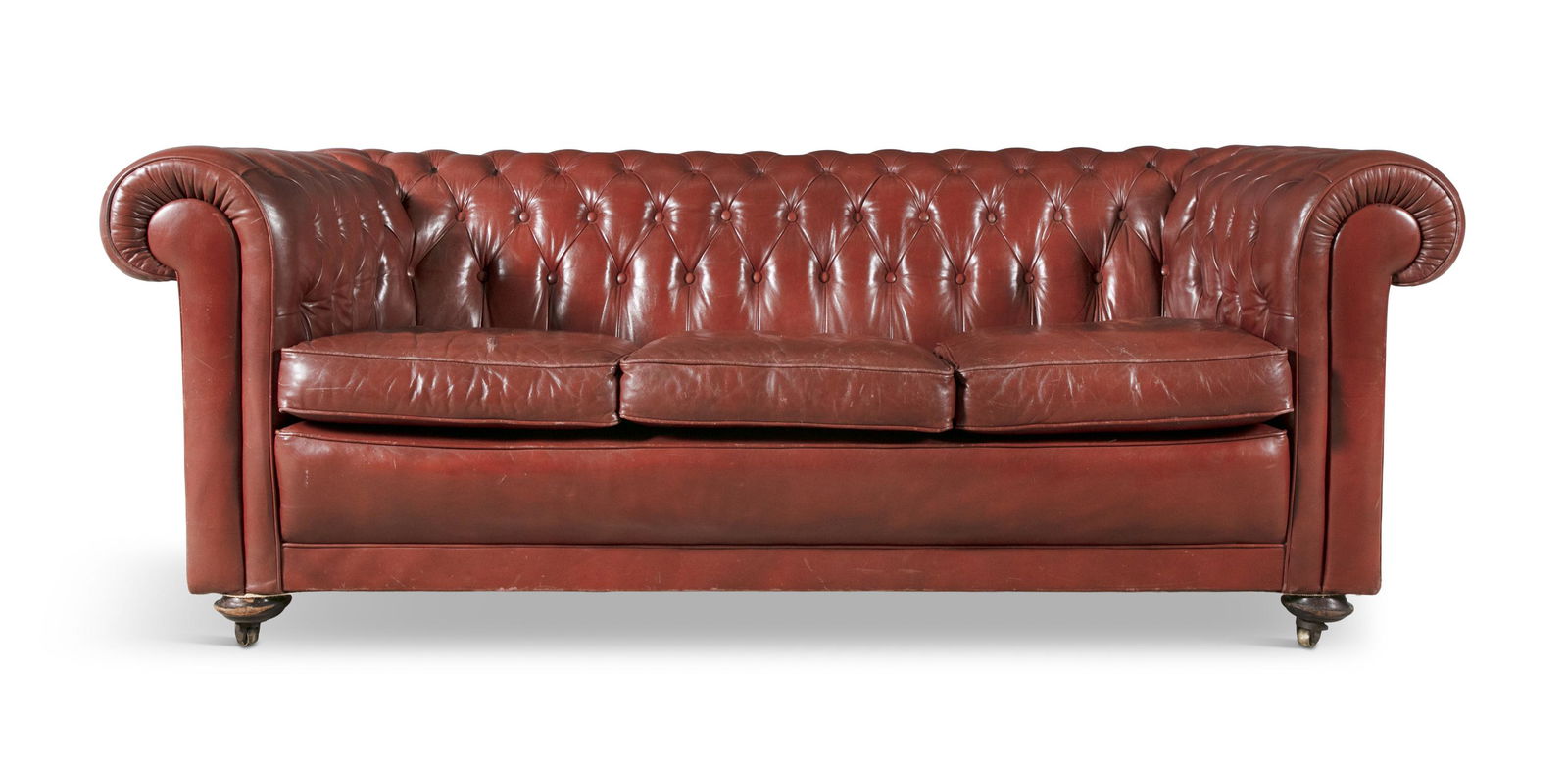 A TAILORED EVEN ARM LEATHER SOFA HAVING BUTTON BACK UPHOLSTERY AND TWO BOLSTER CUSHIONS.Kamelot Auctions4.4(346)$6002 days Left