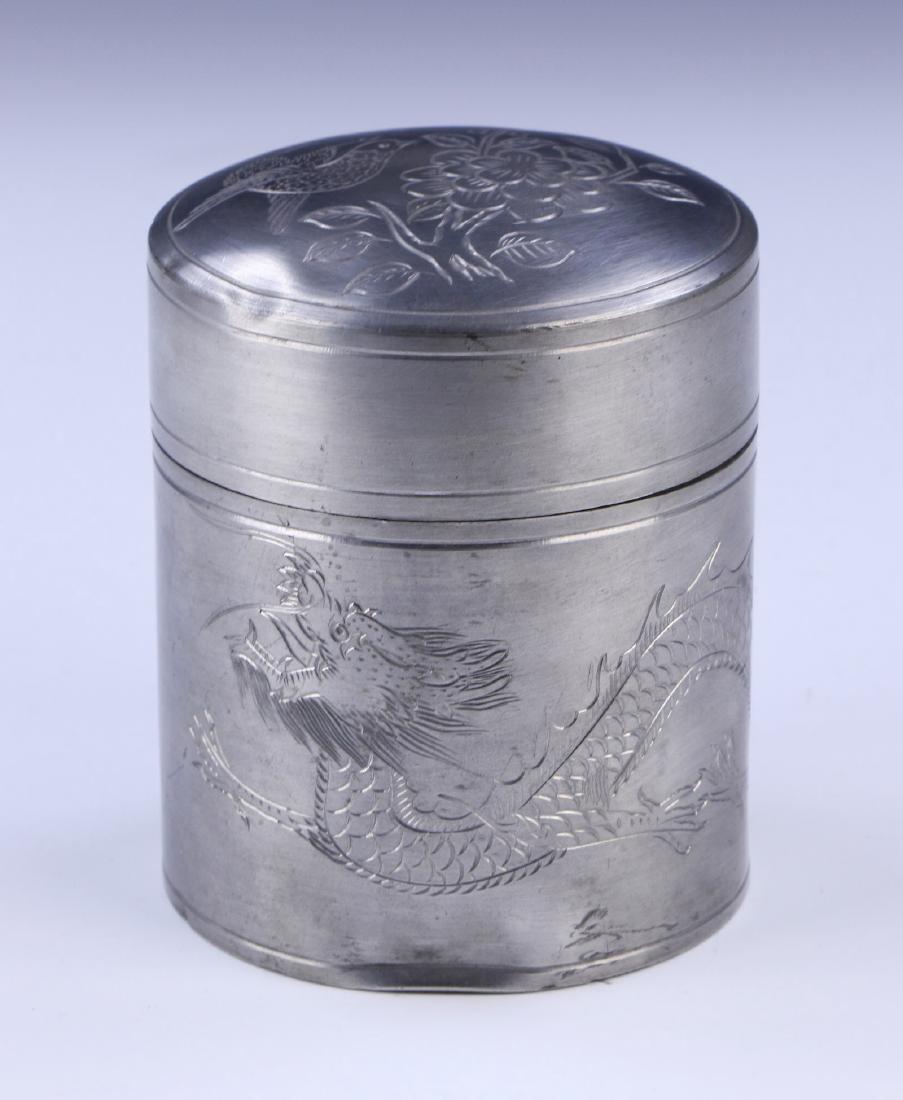 A SILVER 'DRAGON' BOX AND COVER, CHINA, LATE QING DYNASTYMar 11, 2026Arts & Crafts Style Hammered Pewter Lidded Pot – Armada Pewter – English Made18c Chinese scholar PEWTER BOX inlaid flower bush18c Chinese pewter TEA CADDY inlaid BATS long life hallmarked1900s Signed Hand Chased Islamic Art Box in 900 Coin Silver3 hrs LeftAntique Chinese Silver Octagonal Box, Repousse Floral DecorationMar 21, 2026George III Sterling Silver Tea Caddy,Mar 13, 2026Victorian Silver Plate Oval Tea CaddyMar 12, 202619c Chinese pewter TEA CADDY children at playA small sterling silver jar from the Tang DynastyMar 18, 2026Antique Chinese Silver Repousse Lidded BoxMar 17, 2026A fine Chinese silver bowl with relief dragon design on reticulated wooden stand, Tai Chang LongMar 18, 2026Whoopi Goldberg | Silver Plated Tea CaddyMar 11, 2026George III Sterling Silver Tea Caddy,Mar 13, 2026Antique Chinese Lacquered Container Gilt DragonsMar 25, 2026A Chinese pewter(mixed metal) liddedbox.3 days Left