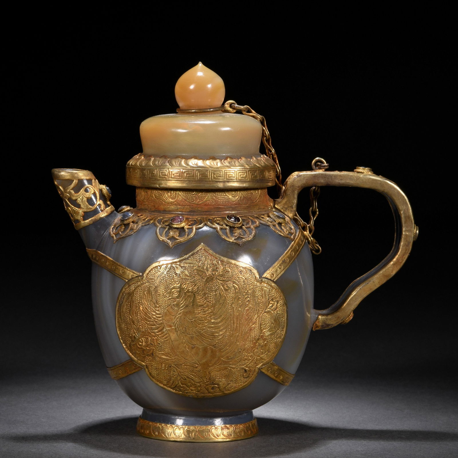 A Chinese Bronze-gilt Mounted Agate Kettle
