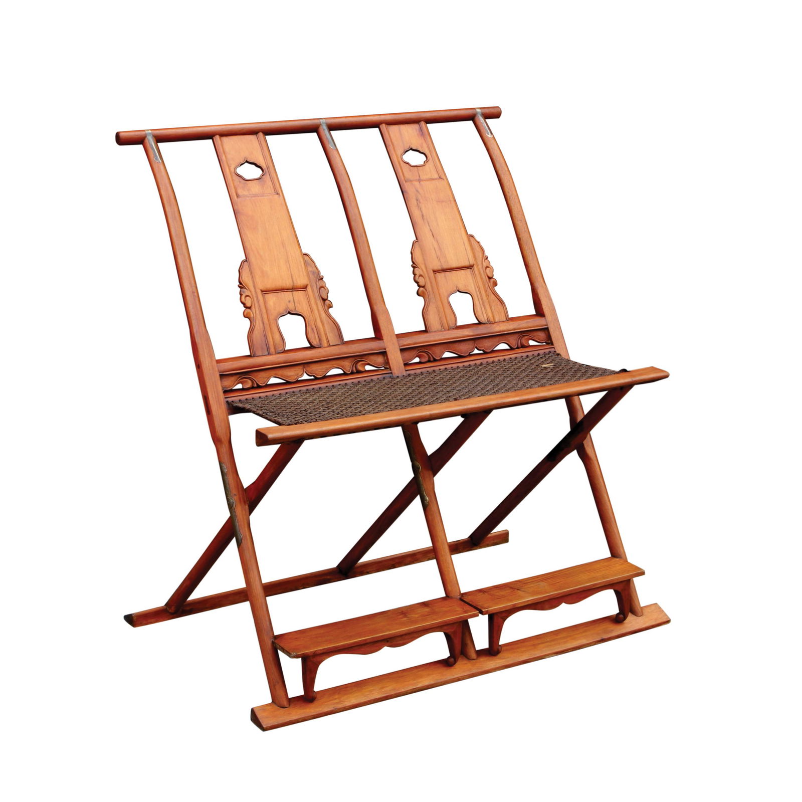 Sold18TH C RARE CHINESE HUANGHUALI FOLDING LOVECHAIRA RARE CHINESE BRASS-MOUNTED HUANGHUALI DOUBLE FOLDING CHAIR , XUANGJIAOYI. 18th Century Chinese Huanghuali wood folding chair with woven seats over x-shaped leg bases terminating into rectangle stretSee Sold Price