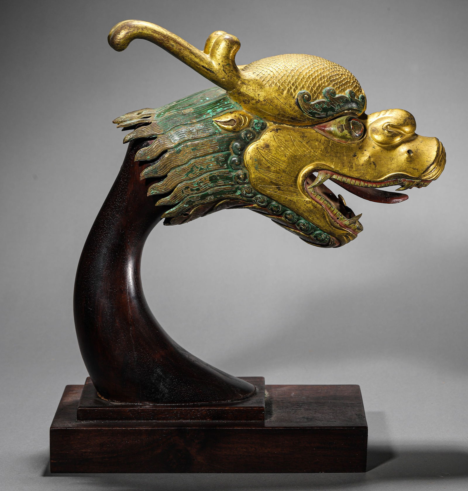 A CHINESE GILT BRONZE DRAGON HEAD.