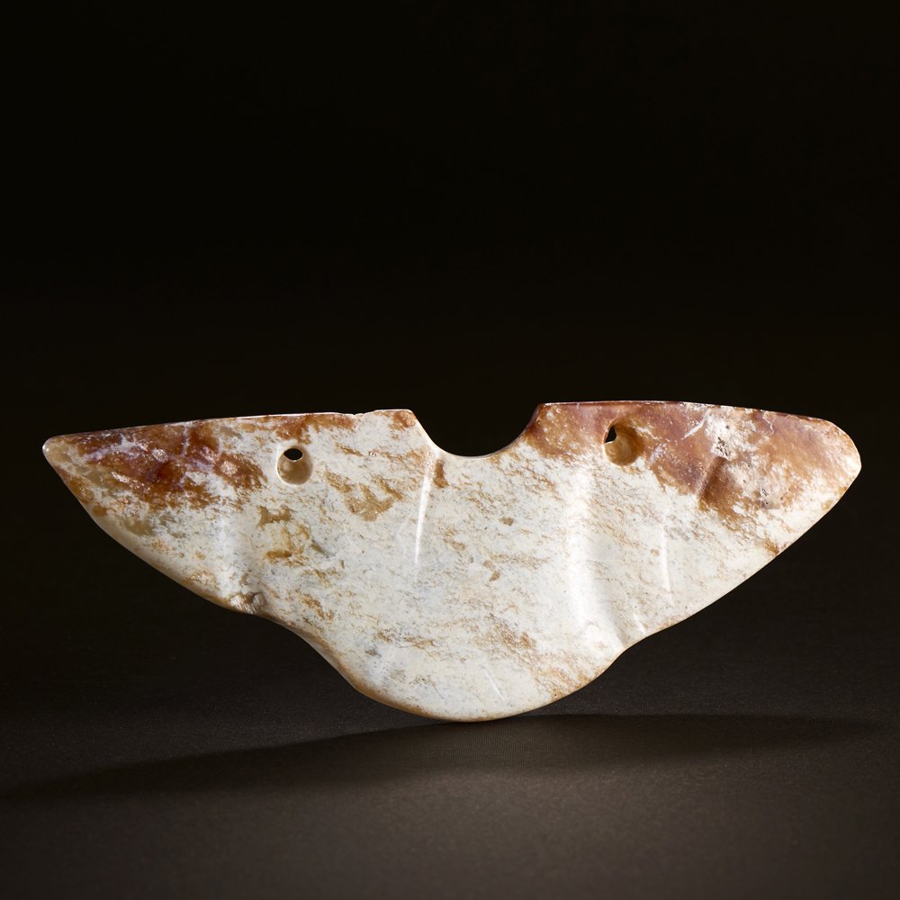 SoldCHINESE JADE HUANG PENDANTMottled brown and celadon jade with two pierced holes at either end. Neolithic period. W. 9.8cm (3 7/8 in.) Provenance: From an old English private collection, acquired from local antique stores and mSee Sold Price