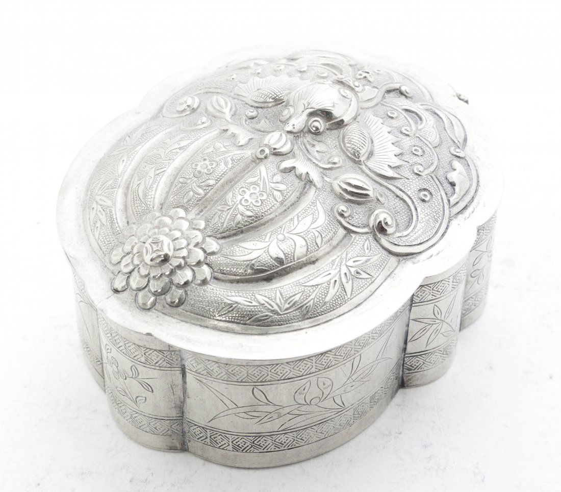 Canton circa 1860 marked Khe Cheong A mid-19th century Chinese silver snuff boxFeb 18, 2026A continental silver box probably Hanau, late 19th / early 20th century, unattributed makerChinese silversmith. Lidded jar richly decorated in relief with flowers and ornaments.Large Antique Chinese Silver & Gilt Covered Box with Insert, Qing DynastyFeb 17, 2026A GEORGE III SILVER OVAL TEA CADDYFeb 17, 2026England circa 1750 A George II unmarked silver table double snuff boxFeb 18, 2026London 1676 by BR in monogram A Charles II sterling silver tobacco boxFeb 18, 2026A Chinese Silvered Porcelain Trinket Box, 20th Century, 83FG2 days LeftA Vintage Silver-Tone Footed Floral Trinket BoxFeb 15, 2026Chinese Gemstone Mounted Silver Covered Box4 days LeftVintage Sterling Silver Chinese Foo Dogs Wealth Repousse Mirrored BoxFeb 19, 2026Solid German Silver Tape Measure Case, 800 Purity14 hrs LeftShanghai or Hong Kong circa 1920, retailed by Wang Hing An early 20th century Chinese export silverFeb 18, 2026Solid German Silver Hinged Box, 800 Purity14 hrs LeftHandmade 925 Sterling Silver Chased Leaf Esrog Box 5.5 x 6.5 InchesFeb 14, 2026Solid Silver Hinged Dresser Box, German Hallmarks, 800 Purity14 hrs Left