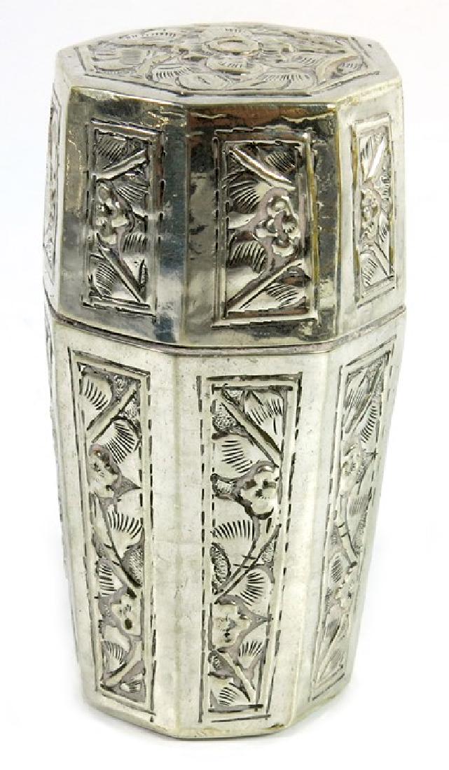 Large Antique Chinese Silver & Gilt Covered Box with Insert, Qing DynastyFeb 17, 2026Small box with lid China, early 20th century75 Lots AwayA Qing Dynasty sterling silver inlaid treasure lid boxMar 07, 2026Persian Silver Repousse Figural Court Vessel 755g.Feb 25, 2026Chinese silversmith. Lidded jar richly decorated in relief with flowers and ornaments.Chinese Pewter Tea Caddy with Stone InlaysFeb 28, 2026A Rare Gilt Silver Figure Pattern Cover JarMar 04, 2026A Qing Dynasty silver-gilt Tibetan auspicious pattern lid jarMar 07, 2026Russian Silver Filigree BoxFeb 25, 2026English sterling silver tall muffineer. Repousse floral decorated body. Armorial crest withMar 01, 2026An Exquisite Silver Inlaid Gems Flower Pattern Box6 days LeftGerman Hanau 800 Silver Repousse Box C.1880-19105 days LeftVintage Sterling Silver Chinese Foo Dogs Wealth Repousse Mirrored Box2 days LeftDutch 833 Silver Locking Tea Caddy Circa 18235 days LeftGorham sterling silver fine tea caddy with paneled body. 3 panels with Elizabethan style engravedMar 01, 2026Vintage Silver-Plate Floral Jardiniere