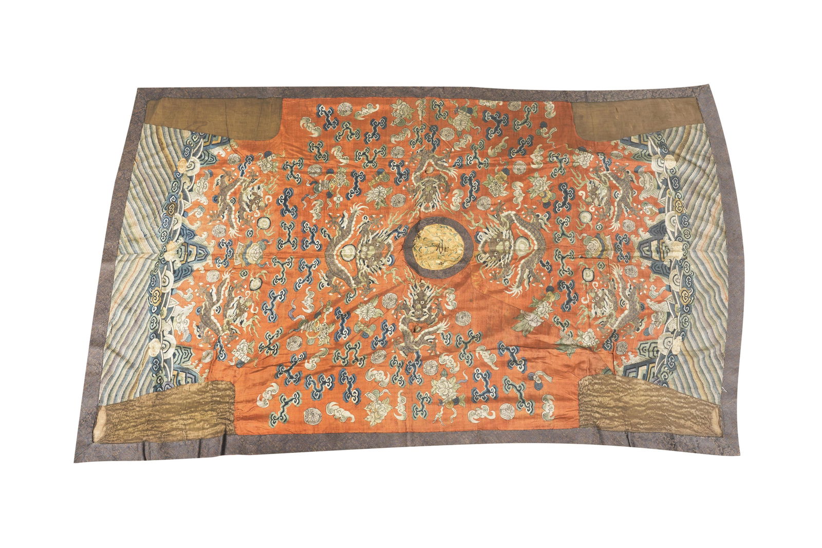 Sold18TH CENTURY CHINESE THANGKAHand painted with a deity in the center. With yellow, green, and floral silk border. H: 38 1/2 in. W: 31 in.See Sold Price