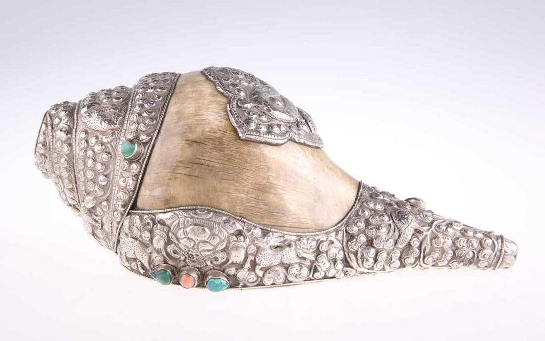 A CHINESE TIBETAN SILVER-MOUNTED CONCH SHELL