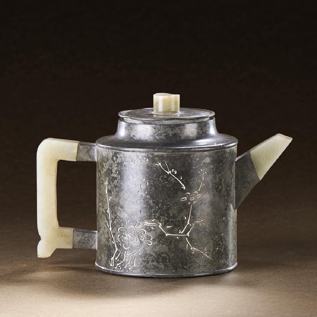 A CHINESE TIN AND JADE TEAPOT