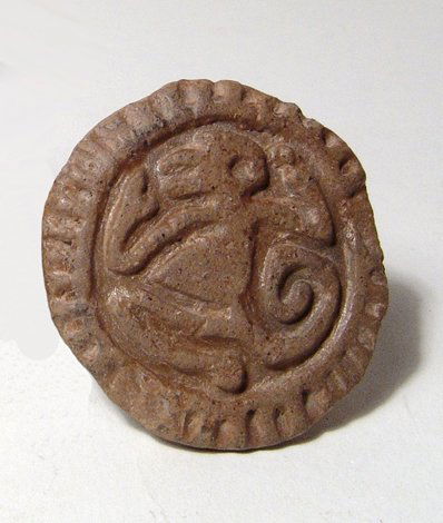 A circular Mayan ceramic stamp with a monkey