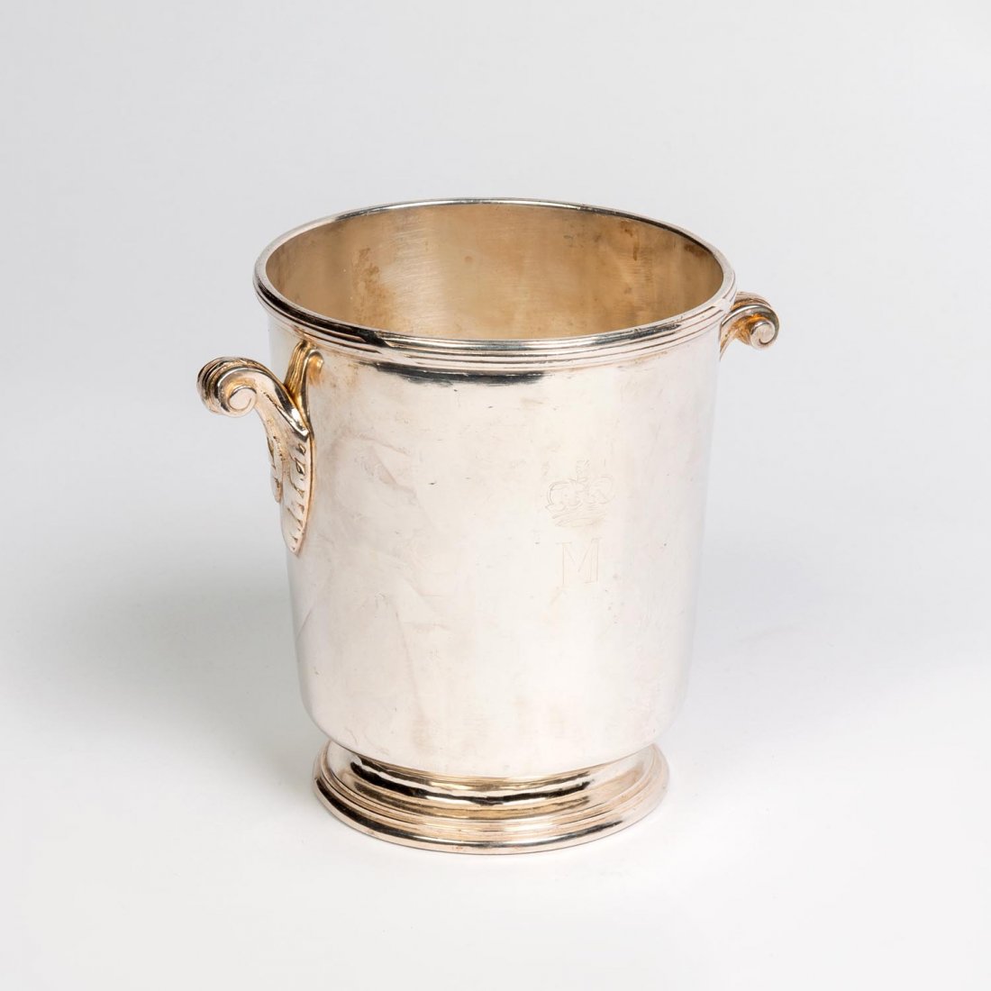 A circular twin handled wine cooler engraved M beneath