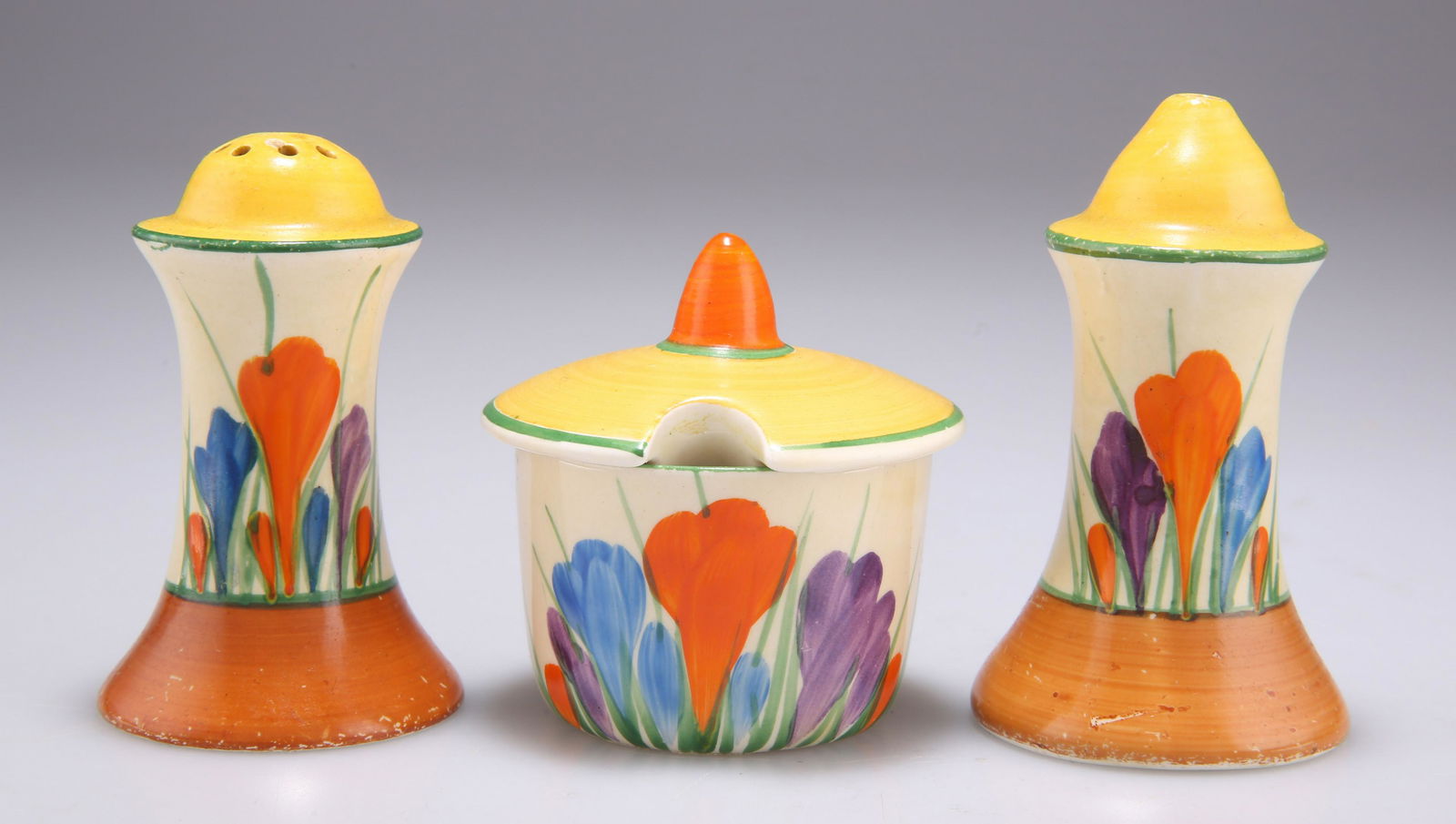 A CLARICE CLIFF BIZARRE CROCUS PATTERN THREE-PIECE CONDIMENT SET