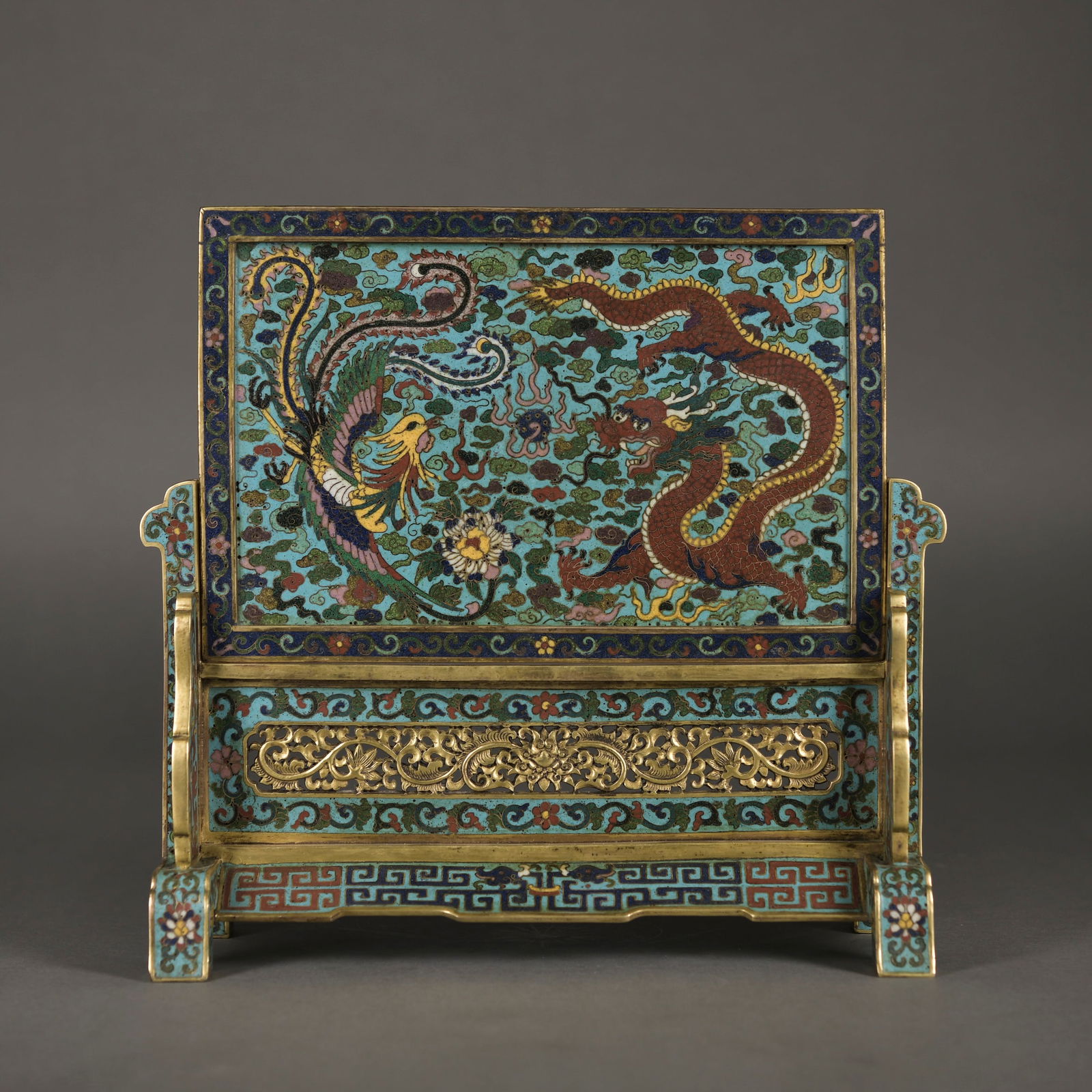 A Cloisonne enamel 'dragon and phoenix' screen