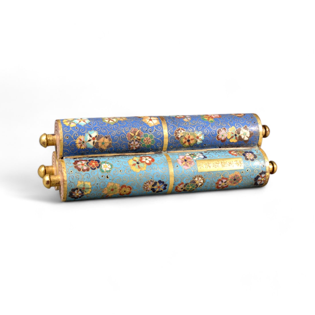 A CLOISONNE ENAMEL SCROLL-SHAPED SCRIPTURE BOX