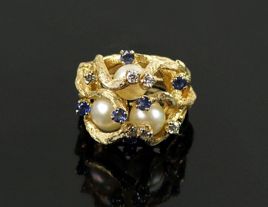 SoldFrench Yellow Gold Cocktail Ring with Diamond Sapphire Mother of PearlExquisite cocktail ring made of 18 karat yellow gold, carved mother-of-pearl and accented with eleven emerald cut sapphire (total weight approximately 1.10 carats) and round transitional cut diamondsSee Sold Price