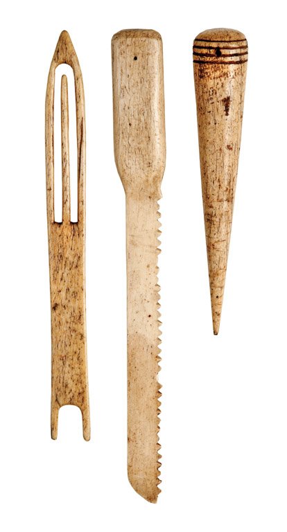 A collection of five whale bone net making tools,
