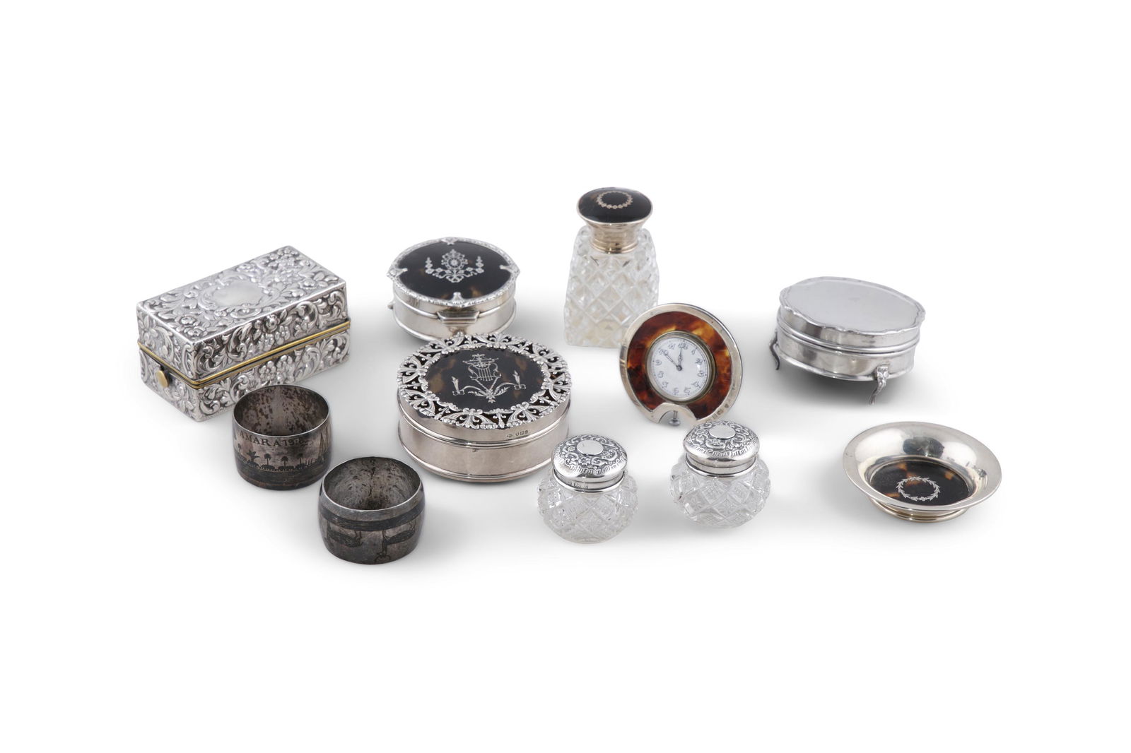 LOT ANTIQUE BRONZE BOXES, VANITY ITEMS, ETCMar 07, 2026ASSORTED SILVER-PLATED AND OTHER ARTICLES, LOT OF SEVENMar 04, 2026Lot of sterling silver dresser accessories, including various covered glass jars and scent bottles.4 days LeftA lot of eight white metal pocket watches (8) Various datesLot of sterling silver accessories and tableware. To include: Chinese wise man figural shakers, O.4 days LeftSTERLING SILVER PARTS,PIECES LOTMar 15, 2026GROUP LOT OF SILVER ITEMS6 hrs LeftLOT OF VINTAGE TIN KITCHENWARE2 days LeftMeriden, Imperial Silver & Others Assorted 9pc LOT1 day Left19th/20th Century Women's Vanity Make-up Sterling Silver Lot (6)Mar 28, 2026Estee Lauder Dunhill Ciner Limoges Compact Mirror1 day LeftSIX ANTIQUE CUT GLASS & CRYSTAL SCENT BOTTLES, ETCMar 07, 2026Various Items6 hrs LeftSilver Items, Various Origins6 hrs LeftSilver Items, Russia6 hrs LeftASSORTED ESTATE SILVER PLATED UTENSILS & TABLEWAREMar 07, 2026