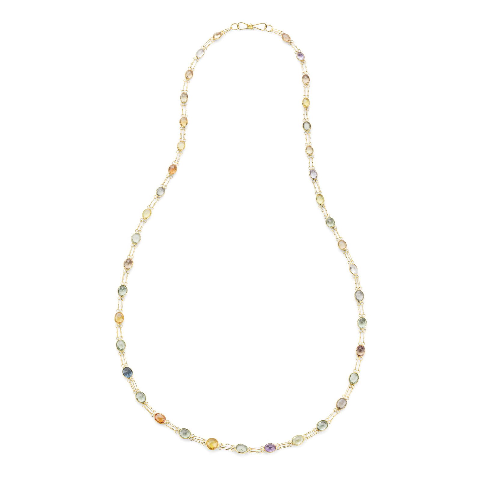 SoldA MULTI-GEMSTONE NECKLACEA MULTI-GEMSTONE NECKLACE various graduated oval-cut gemstones, including coloured zircons, blue and coloured sapphires and garnet, to a fancy double hoop chain necklace. 35cm long, 15.8 grams UsualSee Sold Price