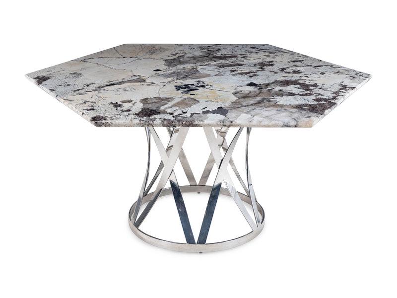 SoldMID CENTURY MODERN MARBLE AND STEEL DINING TABLE, CIRCAMID CENTURY MODERN MARBLE AND STEEL DINING TABLE, CIRCA 1960's/70's, HEAVY FLAT BAR CHROME STEEL BASE WITH WHITE MARBLE TOP, VERY GOOD CONDITION WITH NO CHIPS, TOP MEASURES 52"W X 28"H, SKU319.07See Sold Price