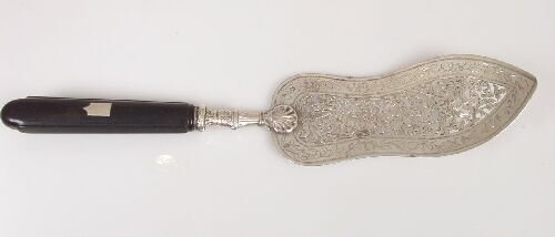 SoldEnglish sterling silver fish slice with engraved andEnglish sterling silver fish slice with engraved and pierced blade, London, circa 1897, cement-filled handle with dent with slight damage, 12-1/2" longSee Sold Price