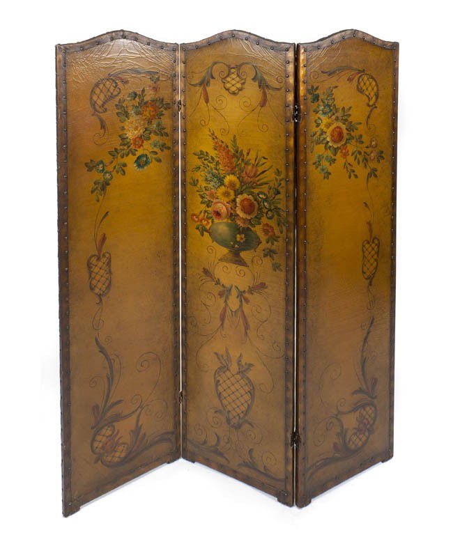 A Continental Painted Leather Three-Fold Screen, H