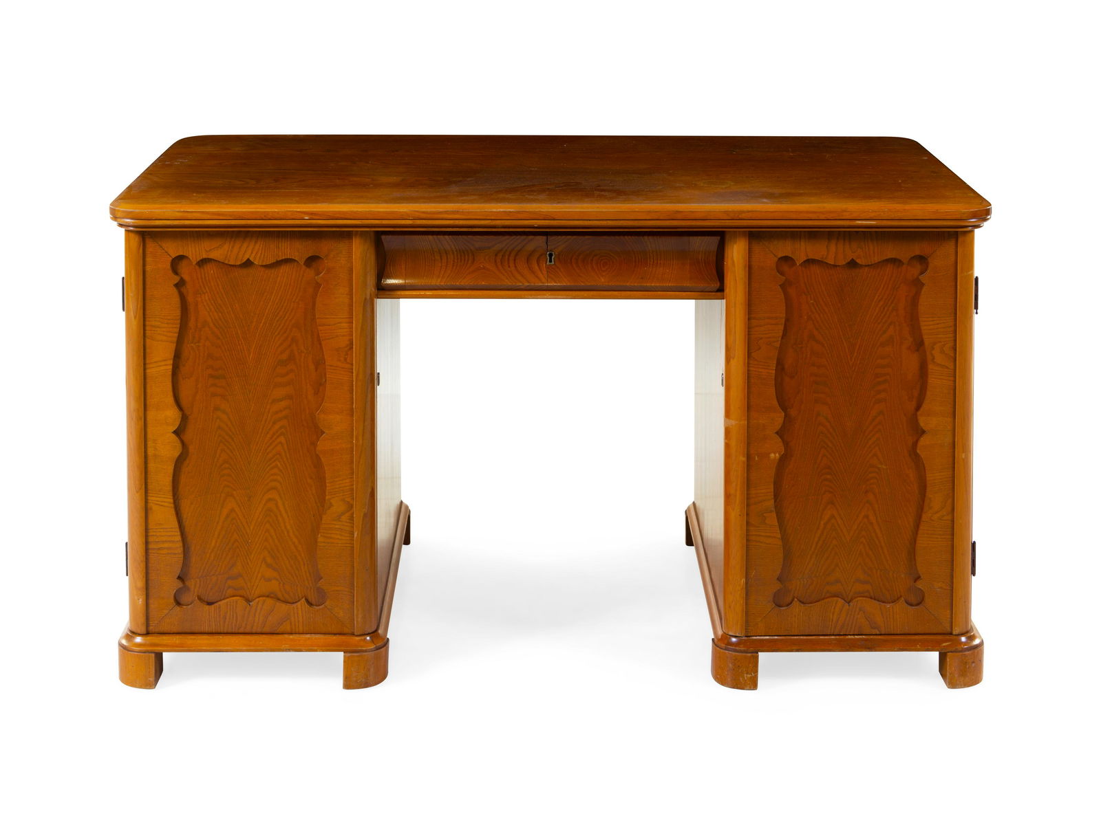 SoldContinental Inlaid Oak Pedestal deskContinental Inlaid Oak Pedestal Desk, early 20thc., probably German or Austrian, shaped top, frieze drawer flaned by two cabinets, lobed feet, h. 31 1/2 in., w. 63 in., d. 31 in. IMPORTANT: All purchaSee Sold Price