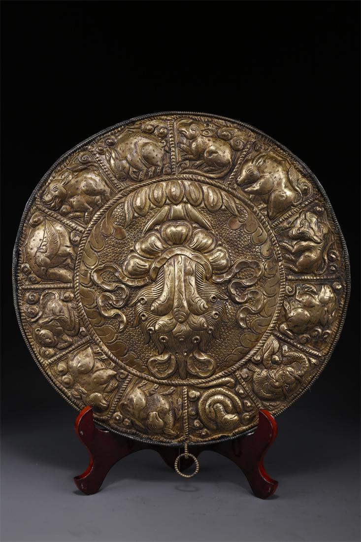 A COPPER CINTAMANI BUDDHIST PLATE.