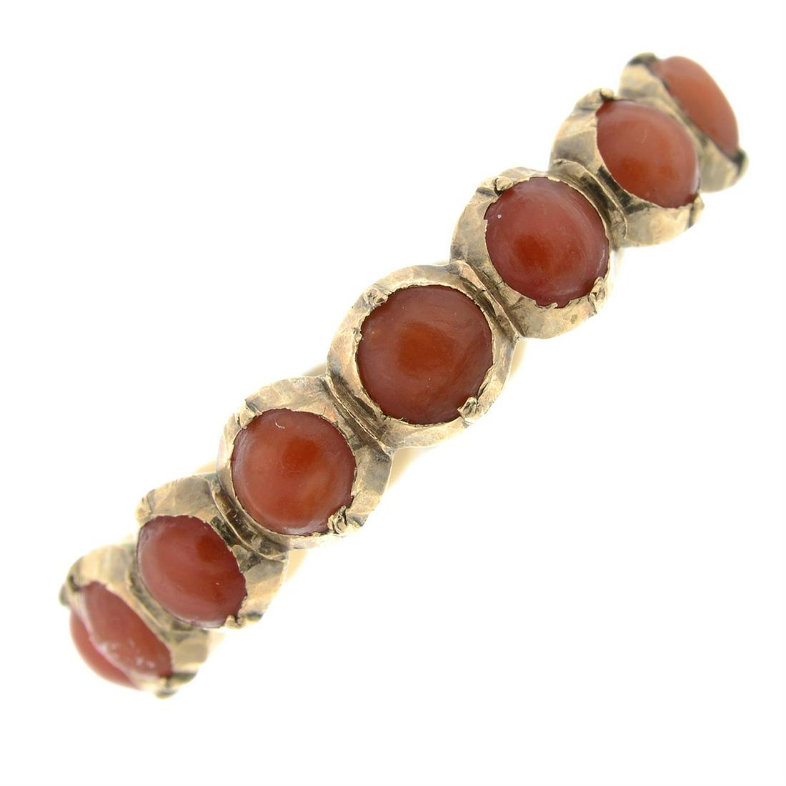 SoldJEWELRY. 18kt Gold and Coral Ring.18kt gold eternity ring displaying (7) bezel set oval salmon coral cabochons of various sizes. Total approx. weight of the ring is 8.1 dwt (gross). Ring size - 6 1/4. From the estate of lifelong colleSee Sold Price