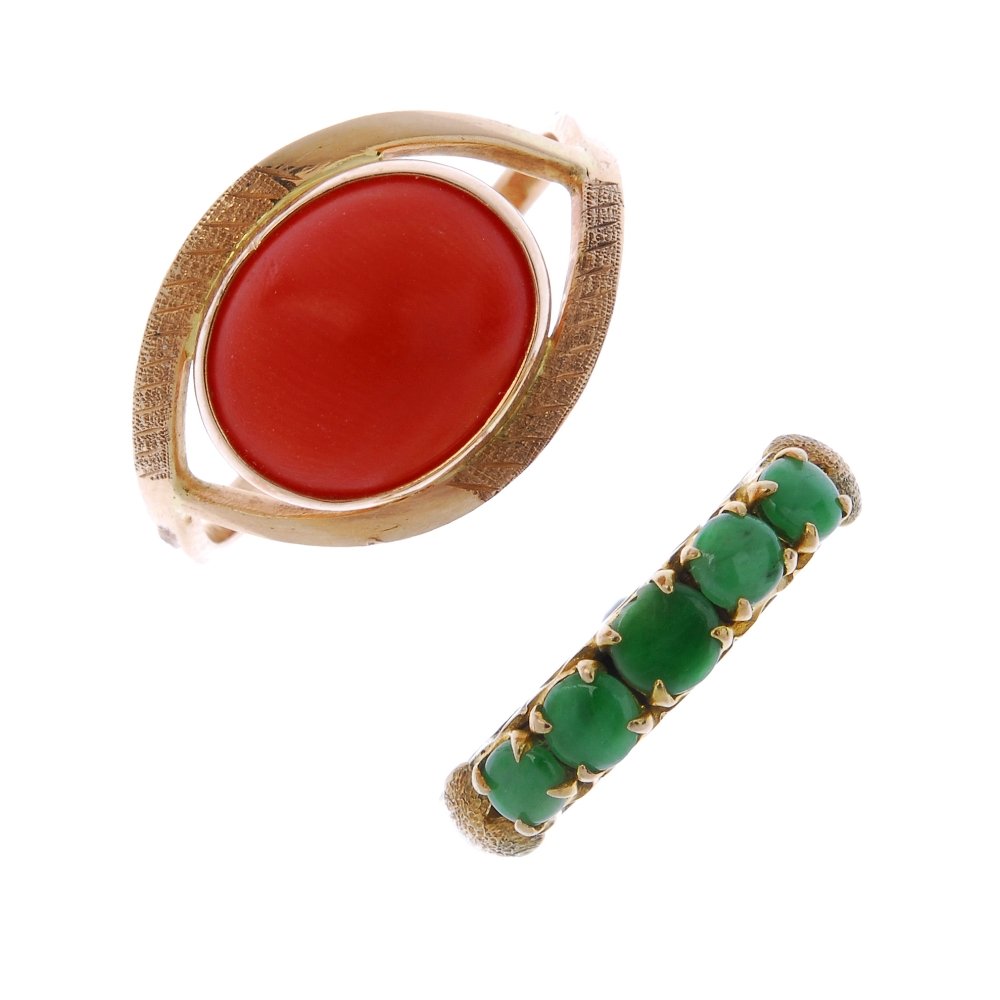 A coral ring and a jade ring.