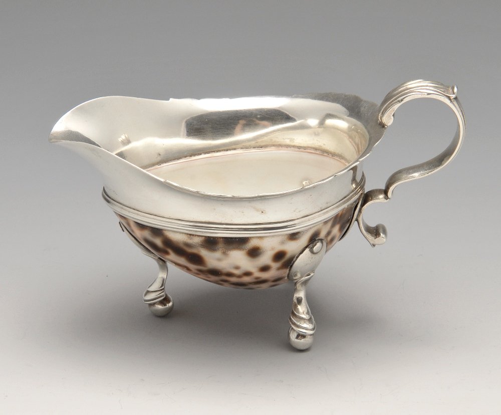 A cowrie shell mounted sauce boat, possibly nineteenth