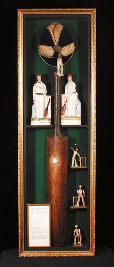 A cricket memorabilia display case, containing a V