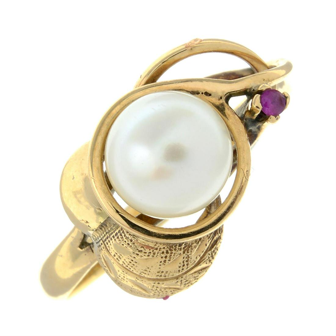 A cultured pearl dress ring, with tapered baguette and brilliant-cut diamond surround.Cultured pearlA cultured pearl dress ring, with tapered baguette and brilliant-cut diamond surround.Cultured pearl estimated diameter 12.8mms.Estimated total diamond weight 1ct, G-I colour, VS_SI clarity.Stamped 18