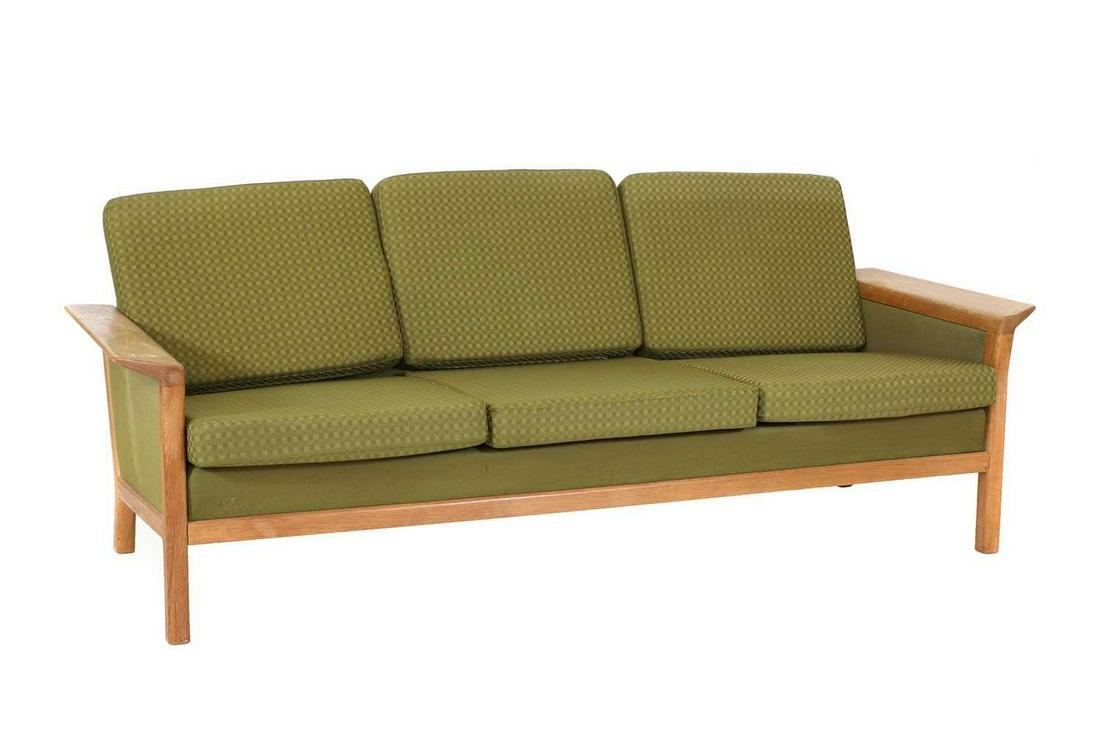 SoldDanish Oak Three Seater Sofa / SetteeDanish Oak Three Seater Sofa / Settee - 30 in tall x 73 x 28.5, Seat height is 15 inches - Similar in style to / possibly by : S. Thrane & Son / Henning Kjaernulf / Guillerme & Chambron.See Sold Price