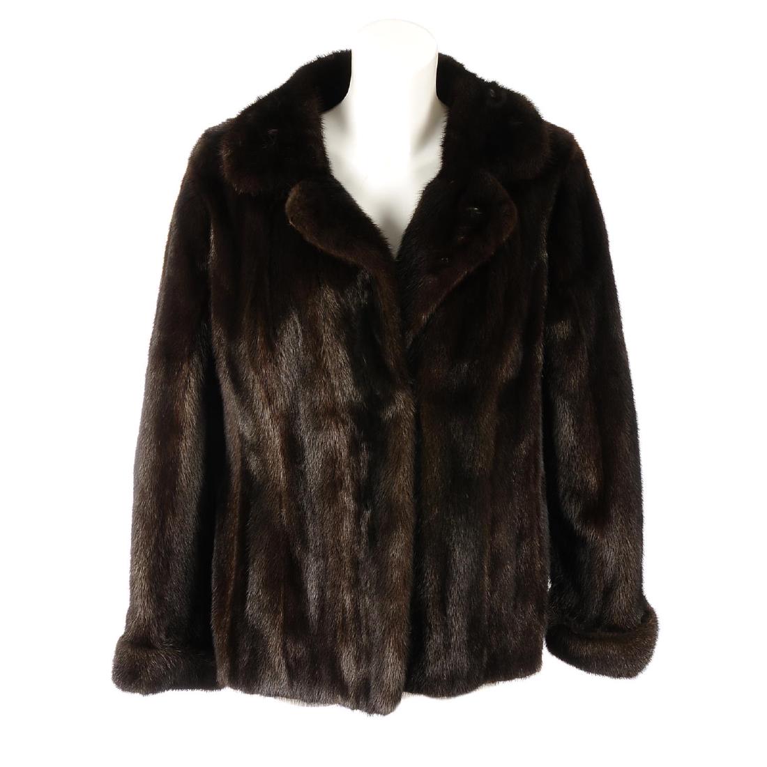 A dark ranch mink jacket. Designed with a notched lapel