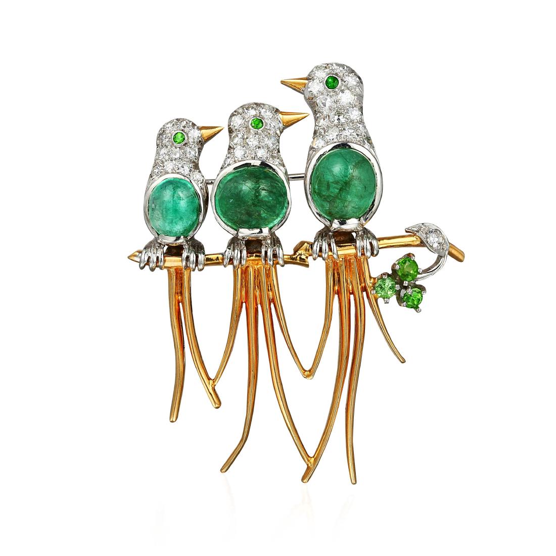 A Diamond and Emerald Bird Brooch