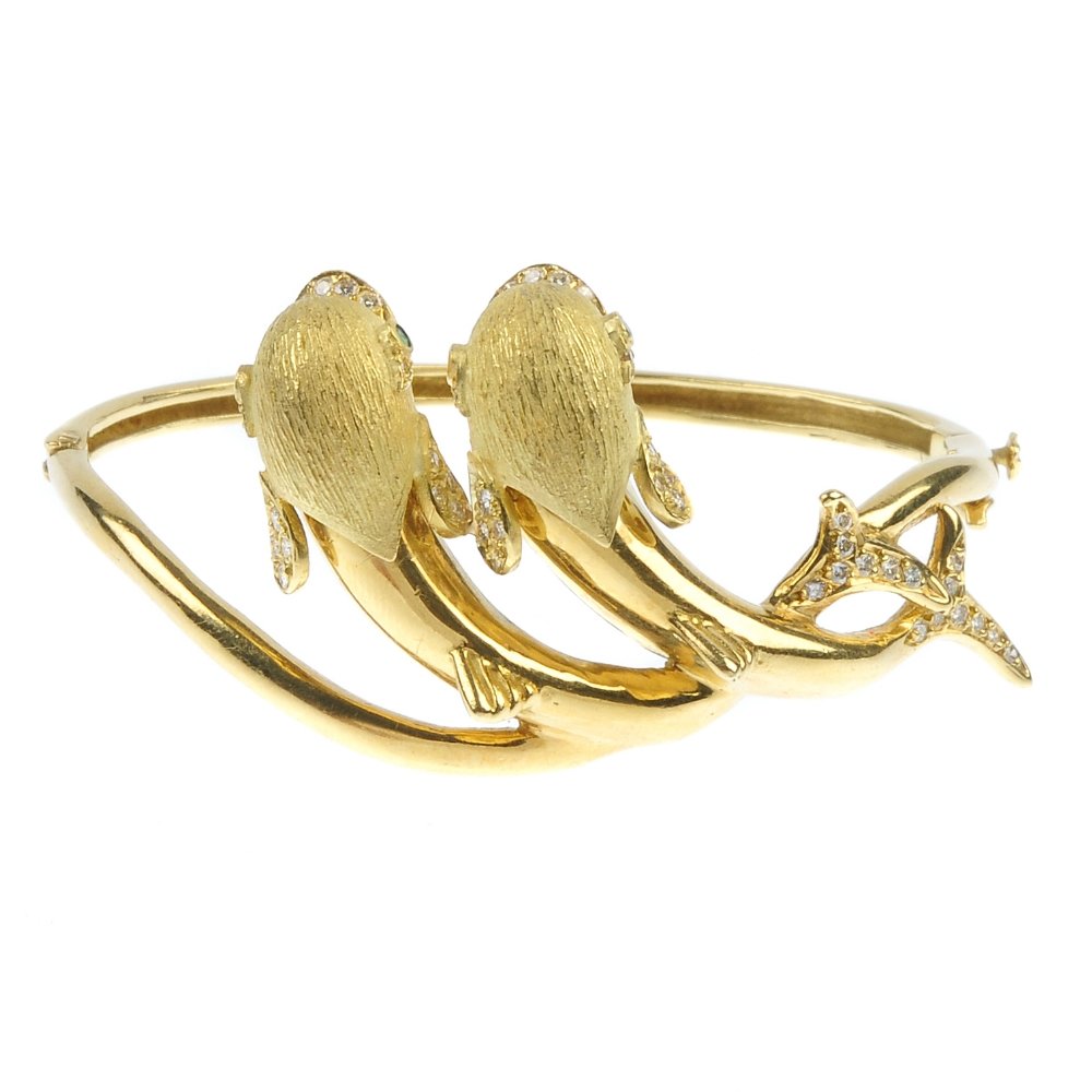 A diamond and emerald dolphin hinged bangle.