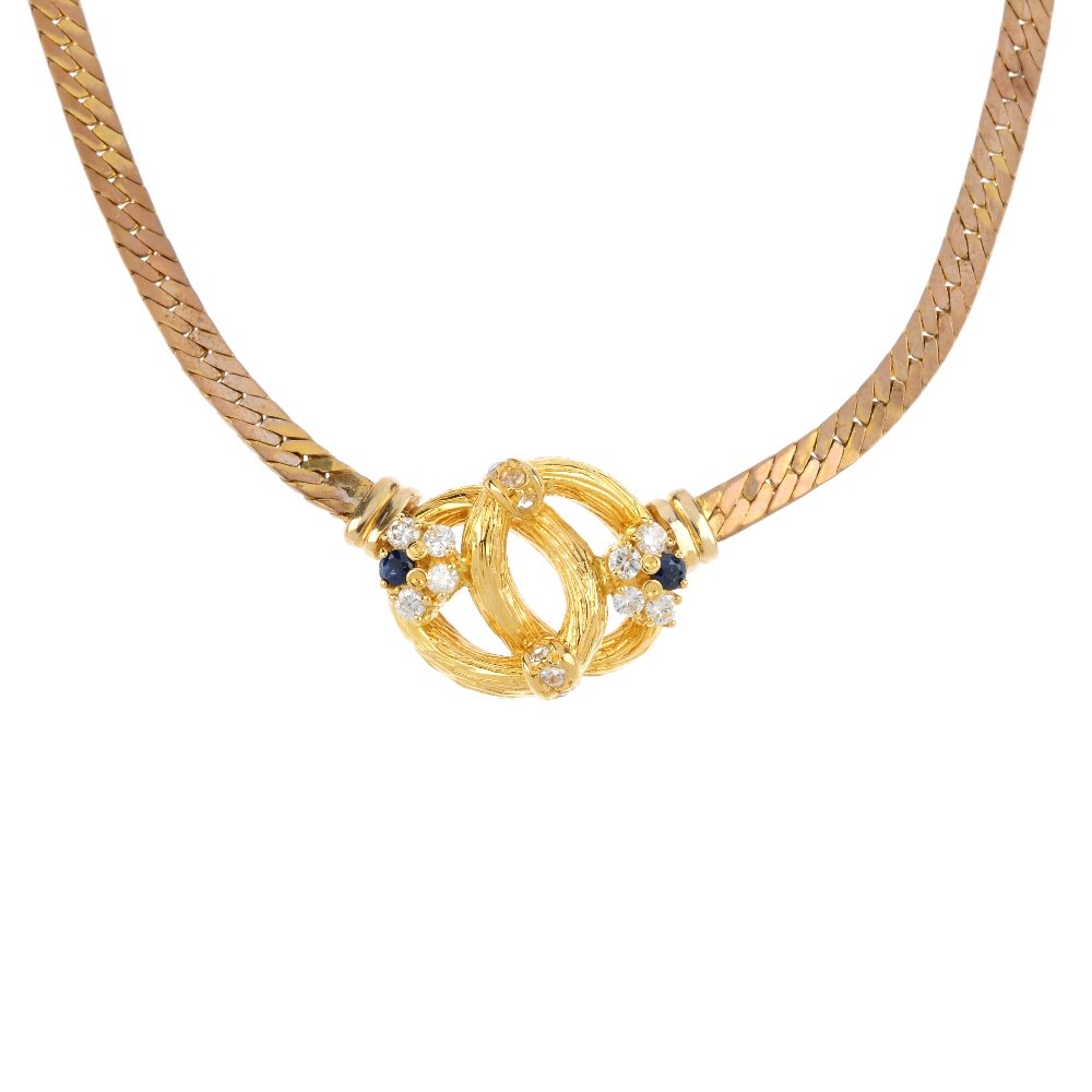 A diamond and gem-set necklace. The front designed as