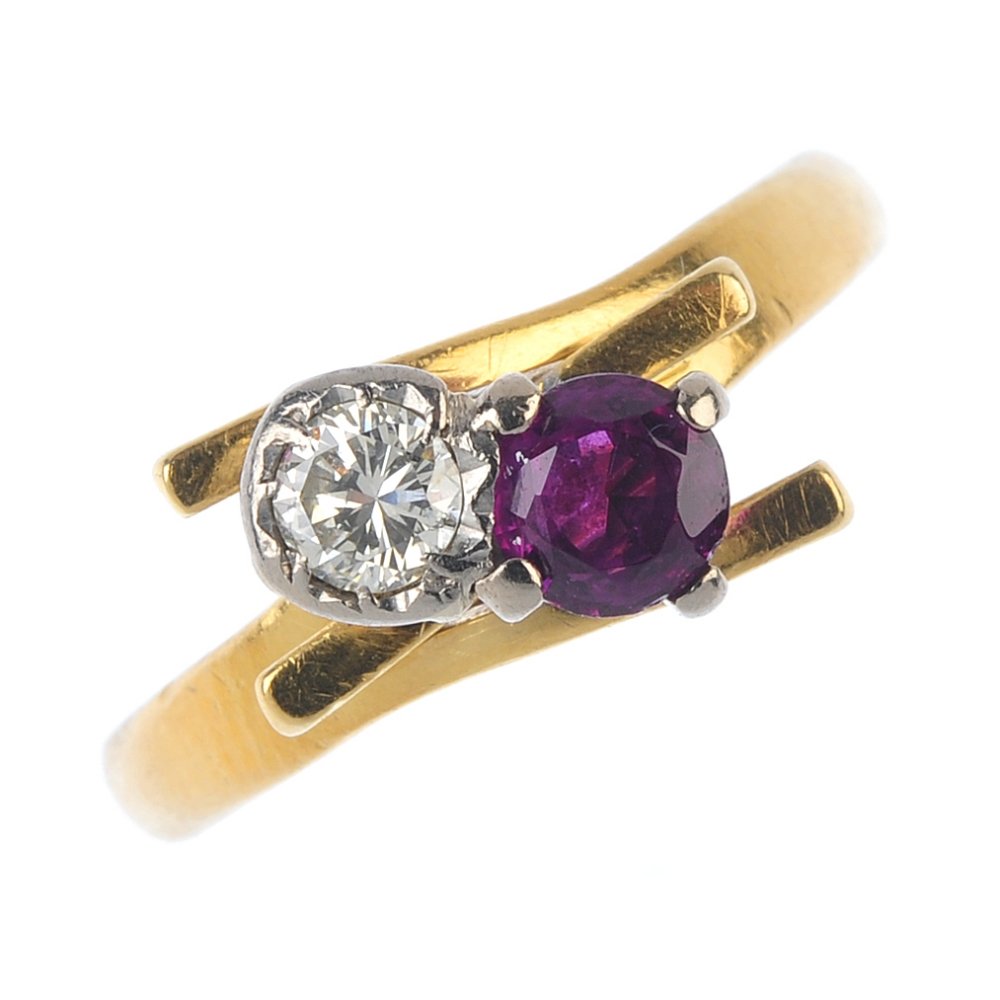 A diamond and ruby crossover ring. The brilliant-cut