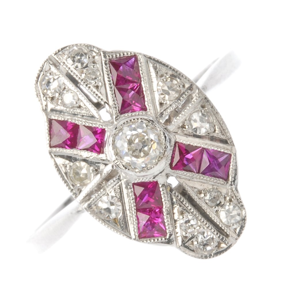 A diamond and ruby dress ring. The old-cut diamond