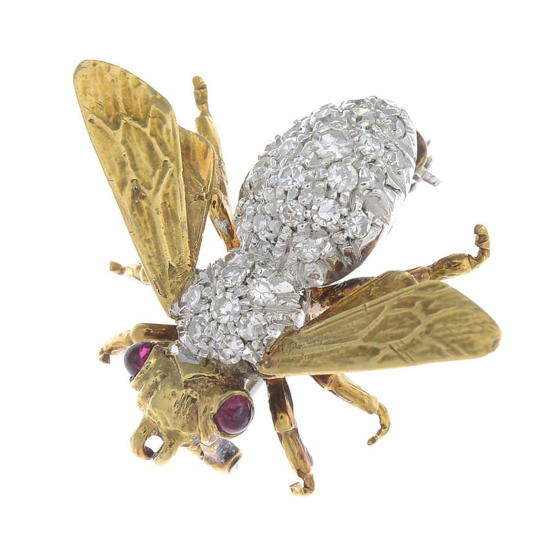 A diamond and ruby fly brooch.Estimated total diamond