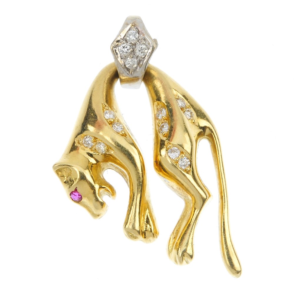 Sold18K Gold, Ruby & Diamond Panther Pendant18K yellow gold, ruby and diamond panther pendant, having approximately 1ct. of diamonds and .25ct. of rubies. 4.6 dwt. inclusive. 20th century, American. In good condition.See Sold Price