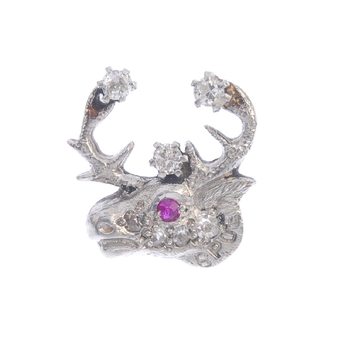 A diamond and ruby reindeer pin. Designed as a reindeer