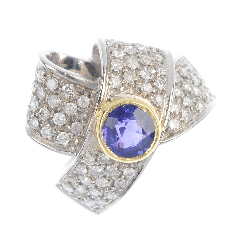 A diamond and sapphire crossover ring.