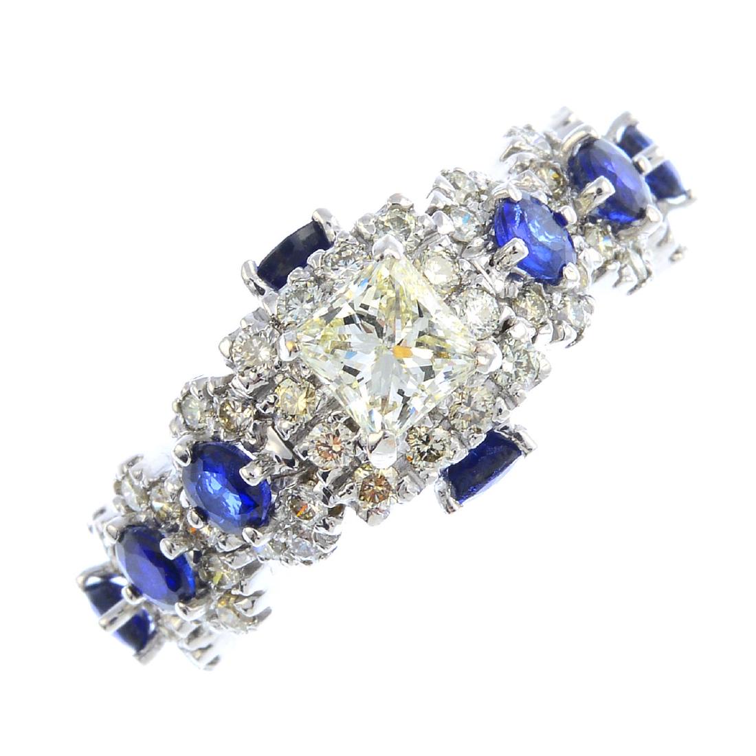 A diamond and sapphire ring. The square-shape diamond,