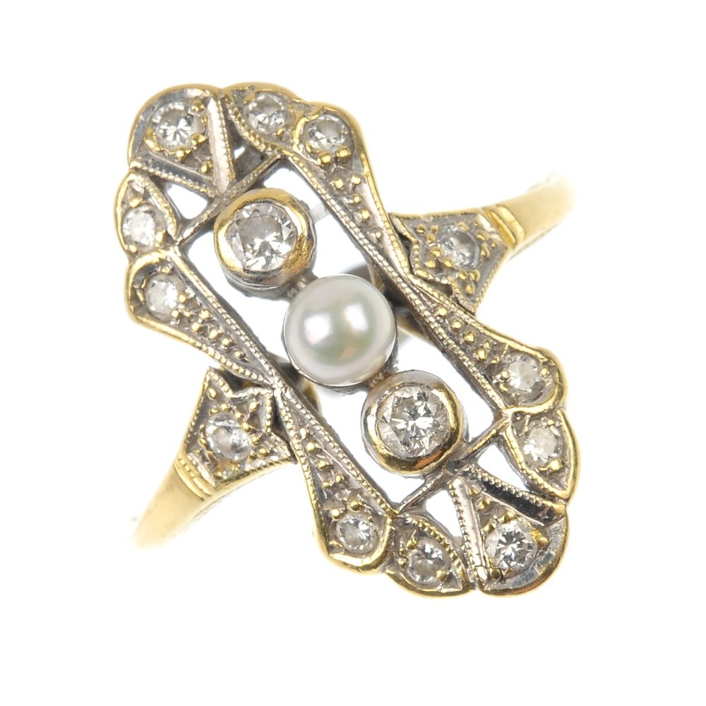 SoldA cultured and seed pearl and diamond dress ring. TheA cultured and seed pearl and diamond dress ring. The brilliant-cut diamond lattice, with cultured and seed pearl spacers, to the tapered half-band. Estimated total diamond weight 1.25cts. Ring size MSee Sold Price