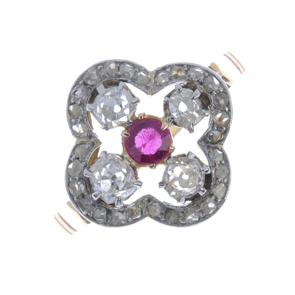 A diamond and synthetic ruby dress ring. Designed as a
