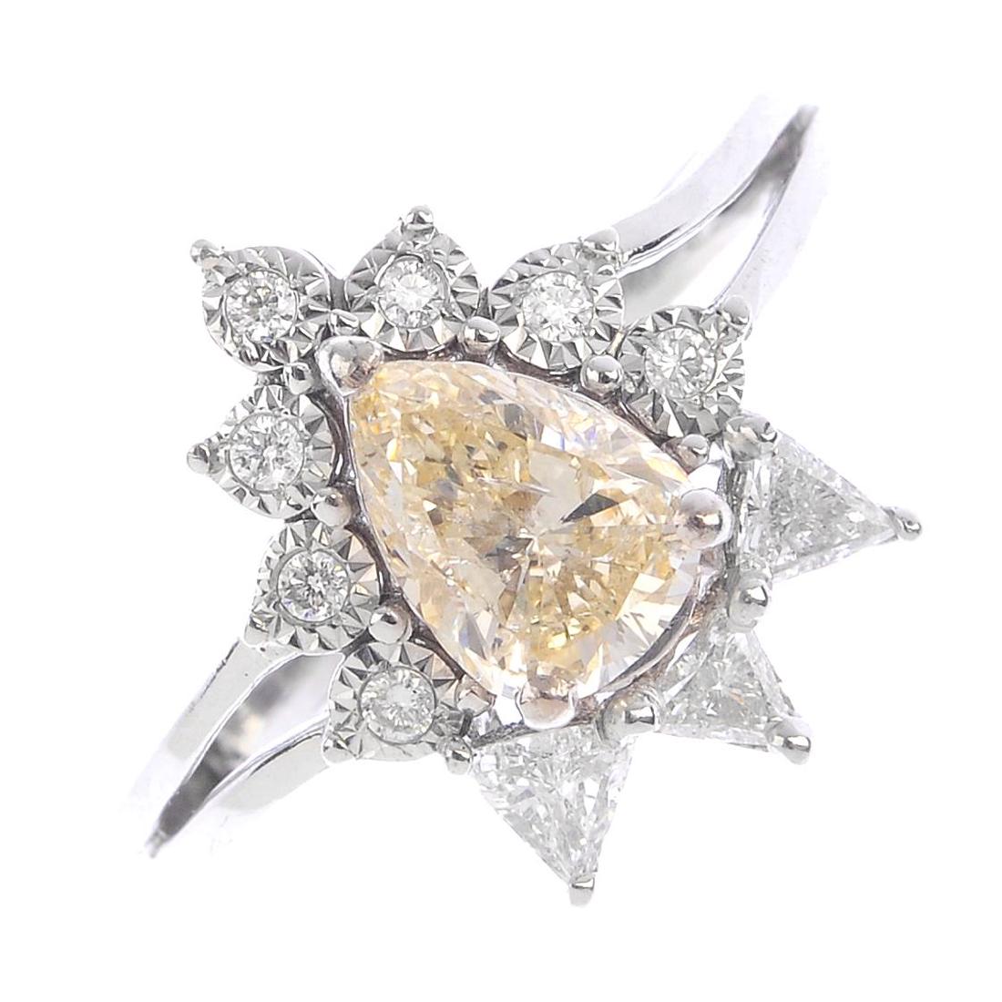 A diamond cluster ring. The pear-shape diamond, within
