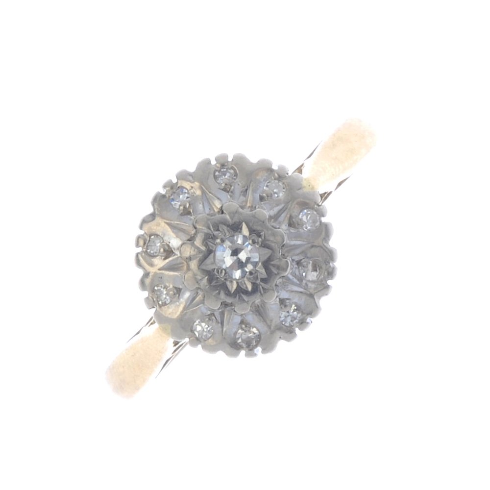 A diamond cluster ring. The single-cut diamond