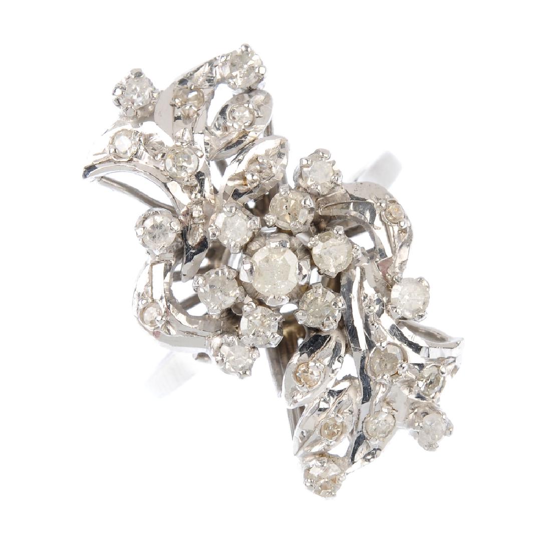 A diamond dress ring. Designed as a scrolling panel,