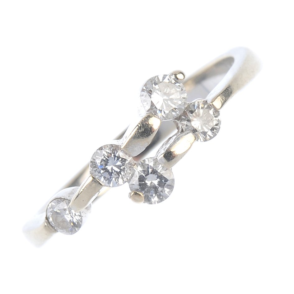 SoldA cultured pearl and diamond dress ring. Designed as aA cultured pearl and diamond dress ring. Designed as a vari-size and colour cultured pearl and brilliant-cut diamond asymmetric spray. Estimated total diamond weight 0.50ct. Ring size N. Weight 5.5gmsSee Sold Price
